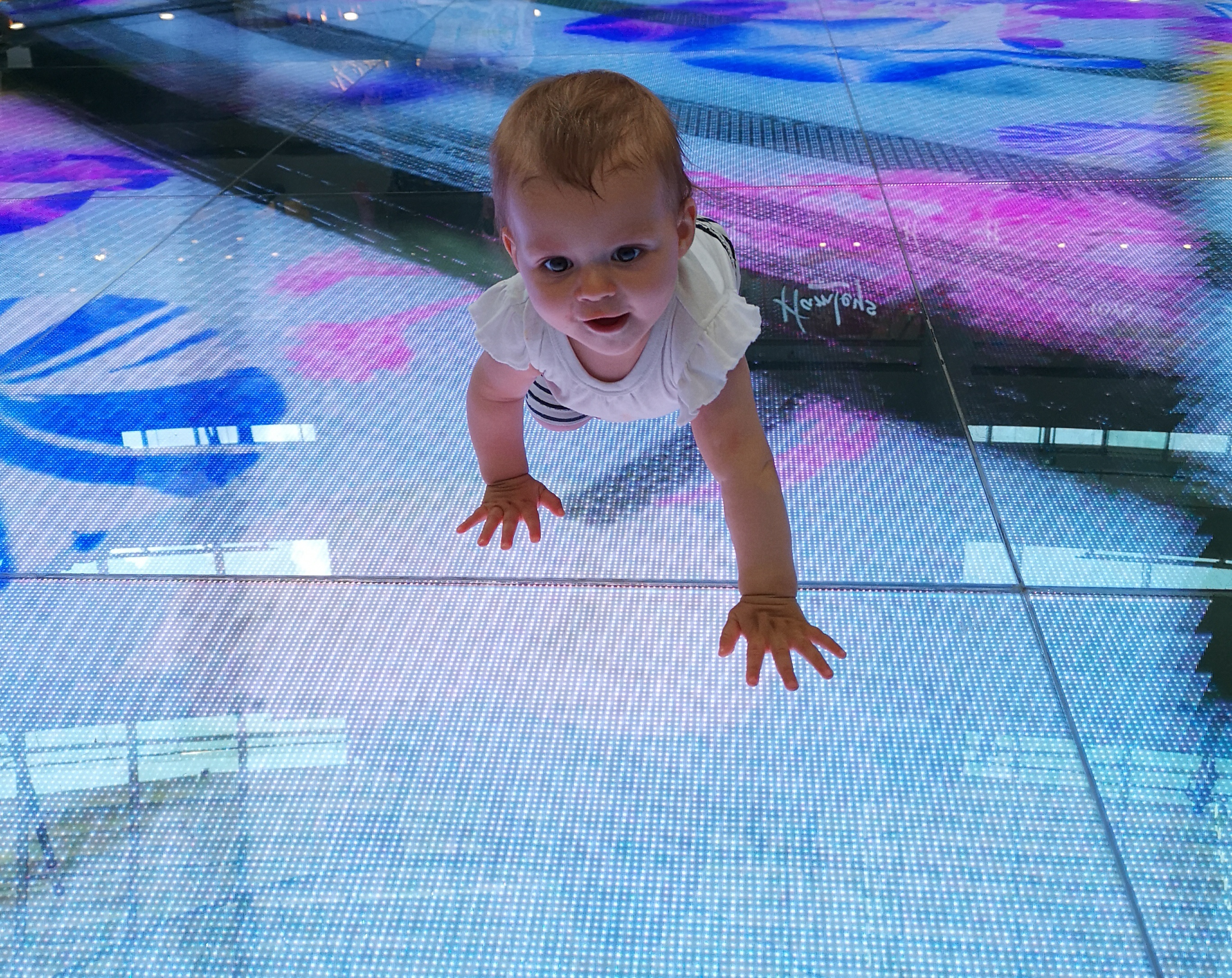 Die nächste Station heute war Marina Bay. Wir haben uns das riesen große Hotel Marina Bay Sands angeschaut und waren im Shopping Center direkt gegenüber. Allerdings waren es für Mama und Papa wohl die falschen bzw. zu teure Shops, wir haben gar nichts eingekauft… Aber dafür durfte ich ganz viel krabbeln und mit anderen Kindern spielen auf einem großen, bunten Lichterteppich (Digital Light Canvas). Das war richtig super. Danach war ich so müde, dass ich gar nichts vom Gardens by the Bay mitbekommen habe, ein schöner und beeindruckender Botanischer Garten.