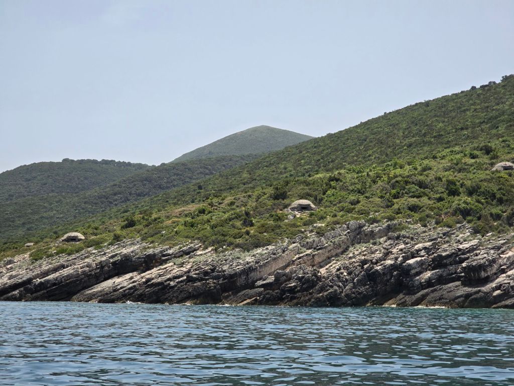 Nach dem Stopp in der Höhle ging es mit dem Boot weiter an der Ostseite der Karaburun peninsula vorbei. Auf der Halbinsel, die unbewohnt ist und nur von der albanischen Armee militärisch genutzt wird, kann man viele Bunker sehen. Diese sind in ganz Albanien zu finden (ca. 200.000) und entstanden zu Zeiten der Herrschaft von Enver Hoxha im sozialistischen Albanien.