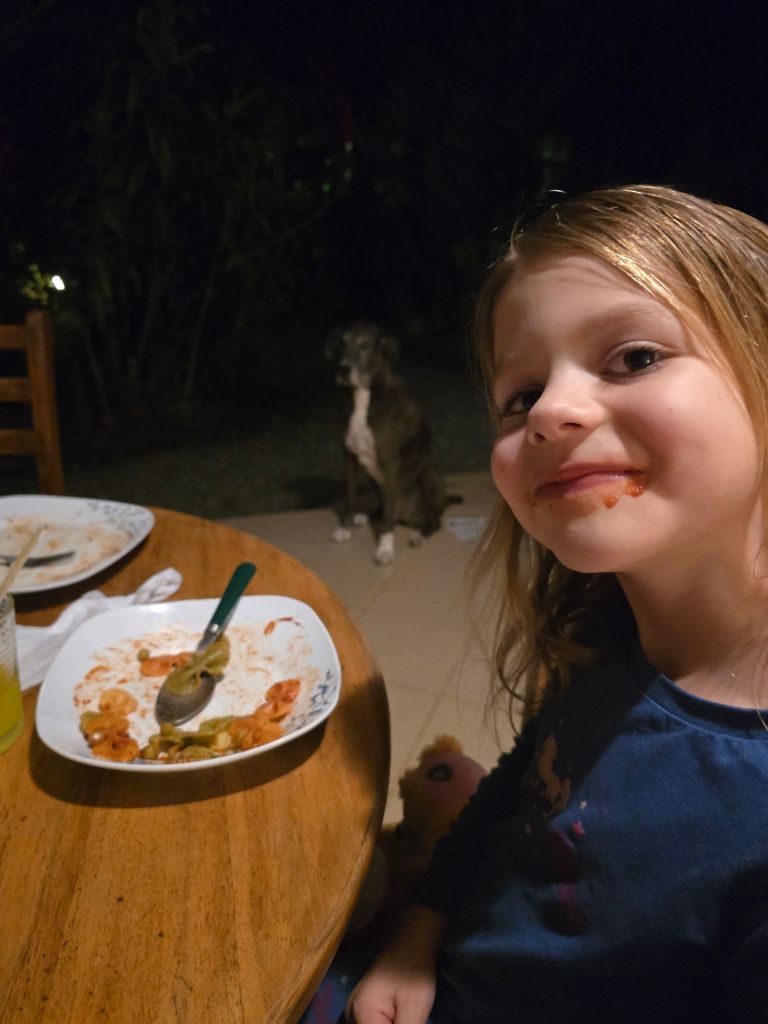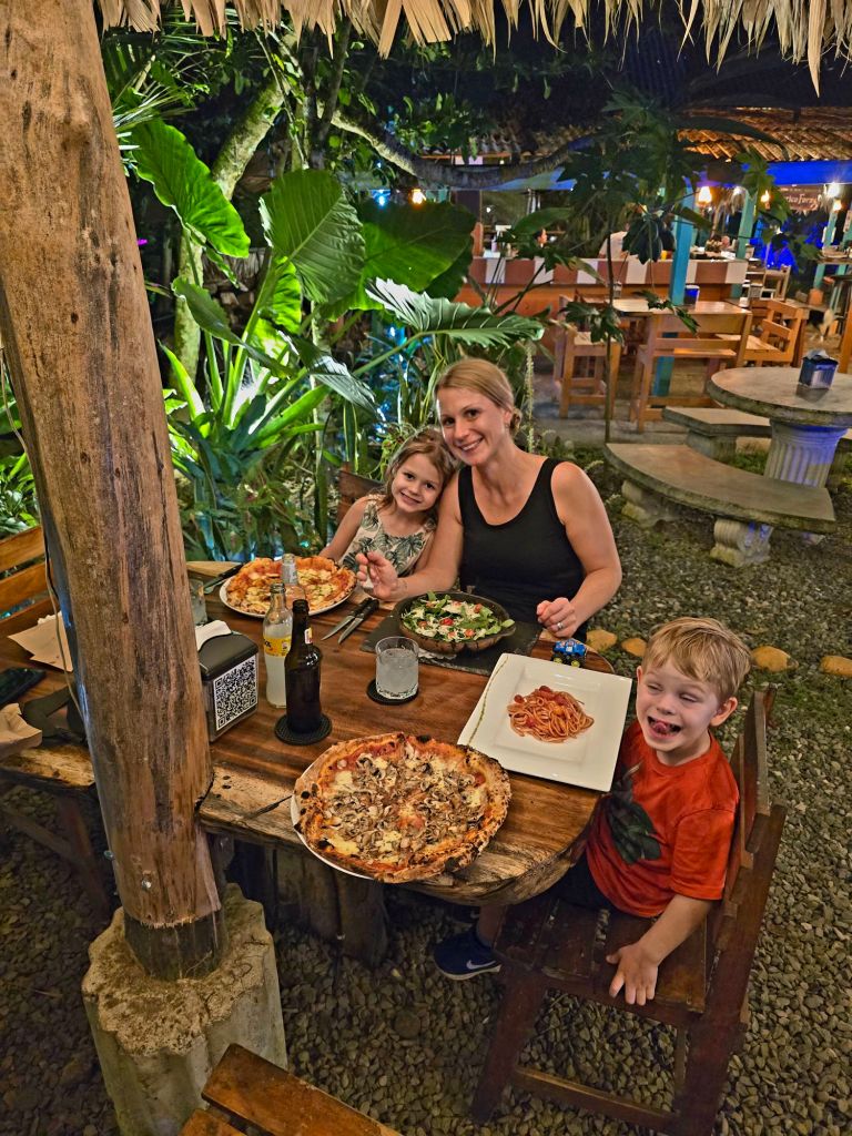 An unserem letzten Abend in Puerto Viejo haben Mama und Papa entschieden nicht selber zu kochen, sondern essen zu gehen. Also gab es für uns heute Abend leckere Pizza und Nudeln (für insgesamt ca. 85€…)