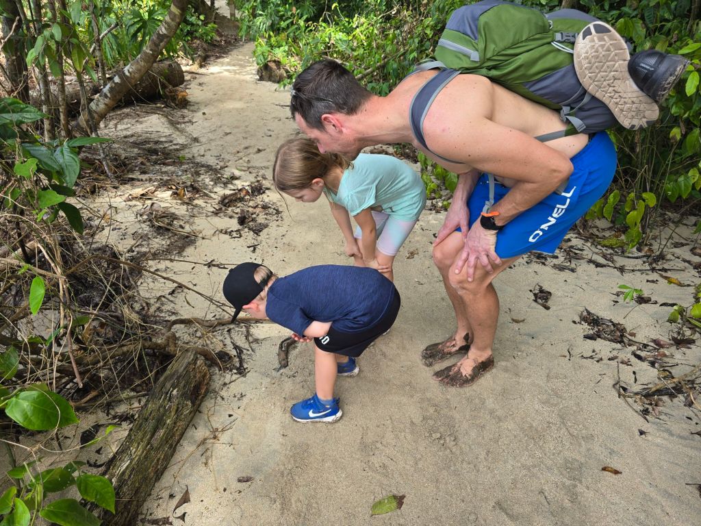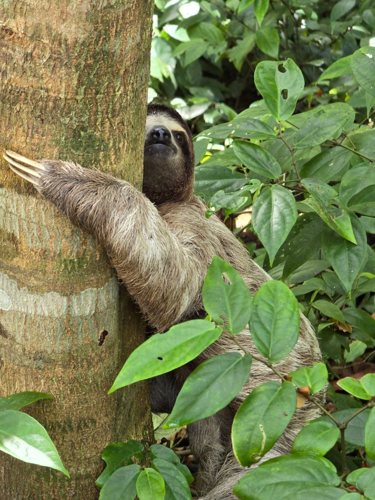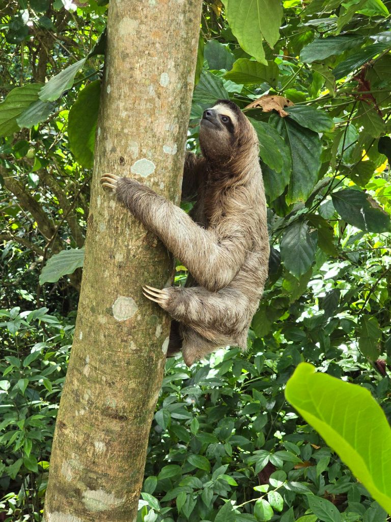 Als es wieder trocken war, haben wir uns auf den Weg zum Ausgangspunkt für unsere Wanderung gemacht. Vom Playa Cocles sind wir am Strand entlang und durch die Wälder bis zum Playa Puerto Viejo gelaufen. Unterwegs gab es einen tollen Aussichtspunkt, Talamanca Viewpoint, und viele Tiere zu sehen. Das Highlight war ein Dreifinger-Faultier, das grade am Boden war. Faultiere sind nur selten (einmal die Woche) am Boden zu sehen, um ihr Geschäft zu erledigen.
