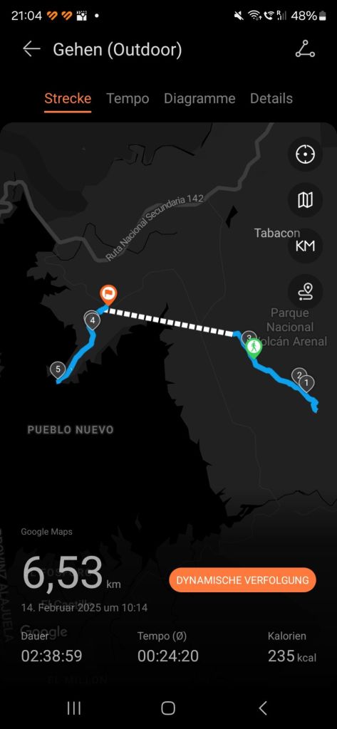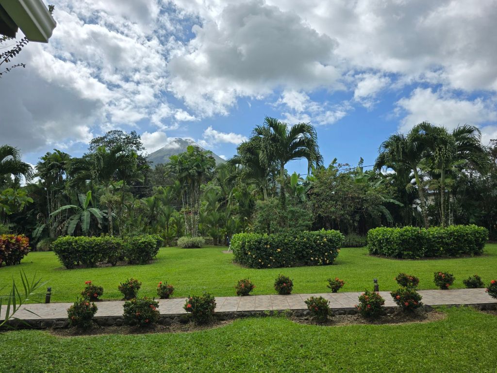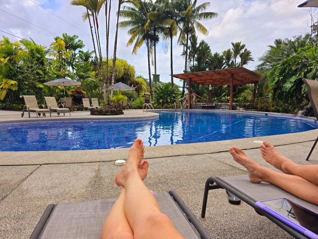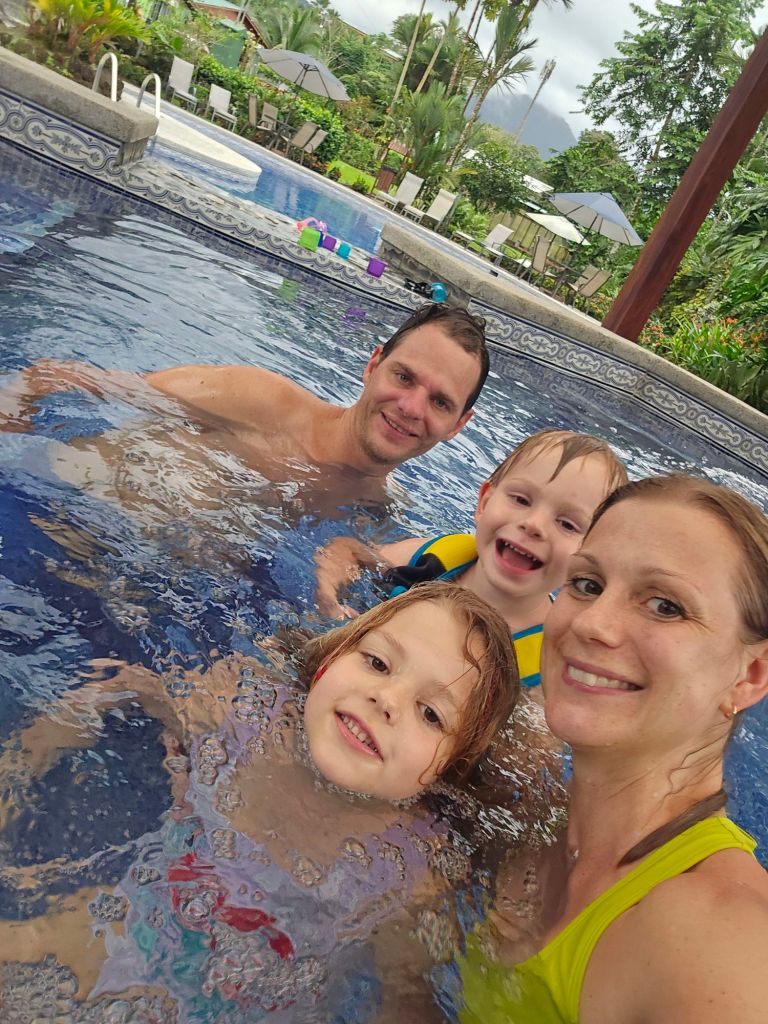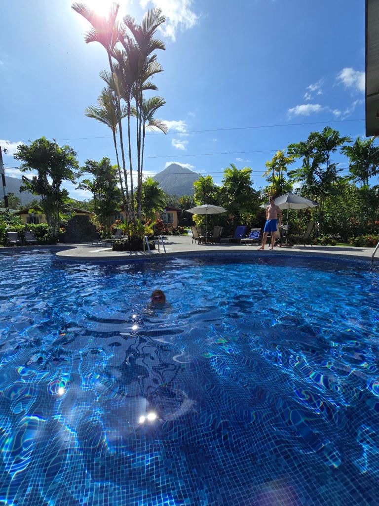 Nach 4,5 Stunden und 272 Kilometer sind wir endlich in La Fortuna angekommen. Wir haben hier eine Unterkunft in einer kleinen Hotelanlage, die aus fünf Bungalows besteht. Es gibt hier einen riesen Garten mit einem tollen Blick auf den Vulkan Arenal (leider war es heute zu bewölkt). Und das Beste hier ist der tolle Pool, dort durften Leonard und ich auch direkt einmal reinspringen.