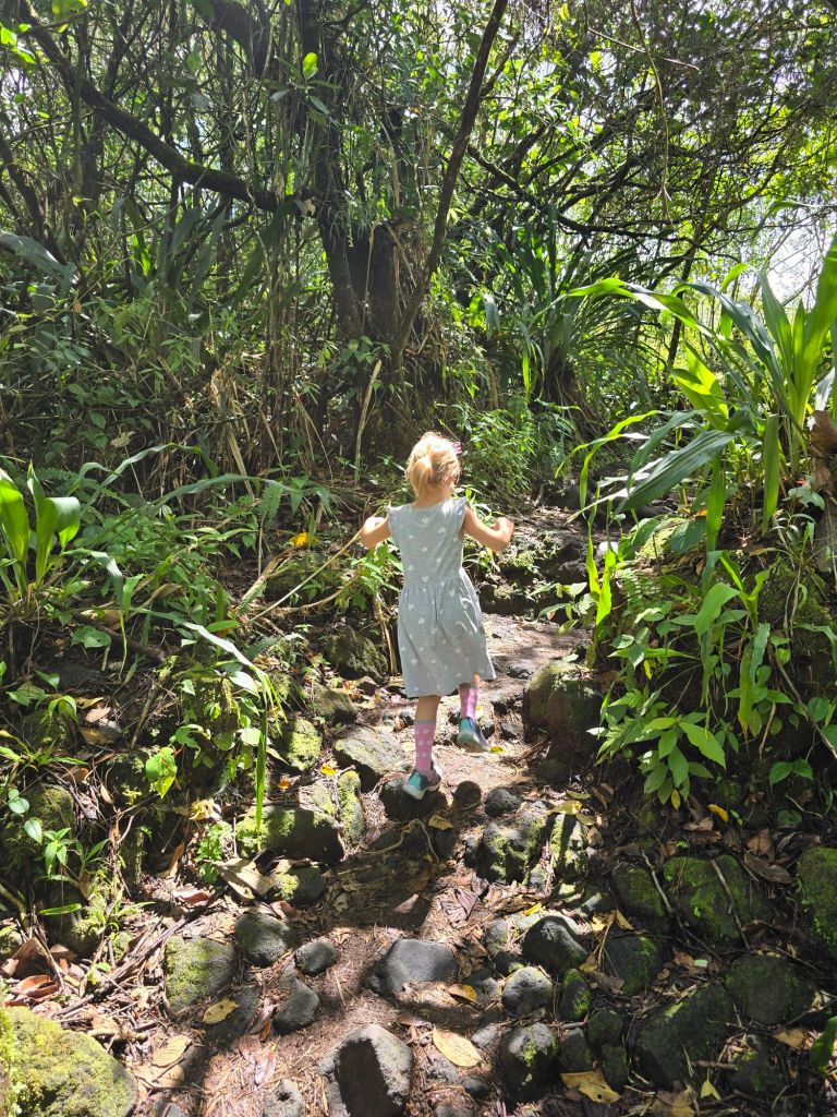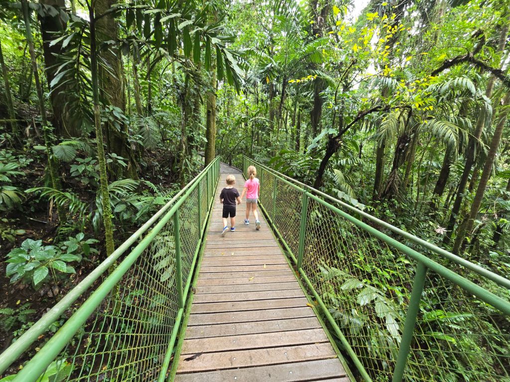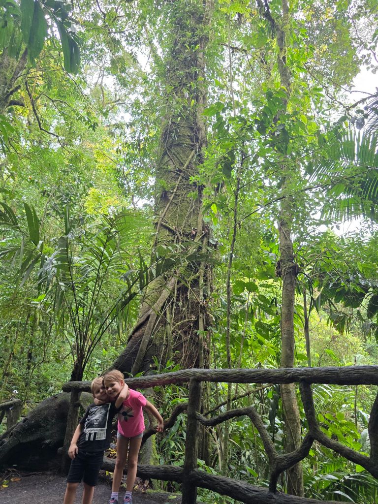Auf einem Rundweg von ca. 4,5 Kilometer durch den Regenwald gibt es verschiedene Brücken, die wir überqueren, davon auch fünf Hängebrücke, die ganz schön wackelig waren. Und an einem Wasserfall sind wir vorbei gekommen.