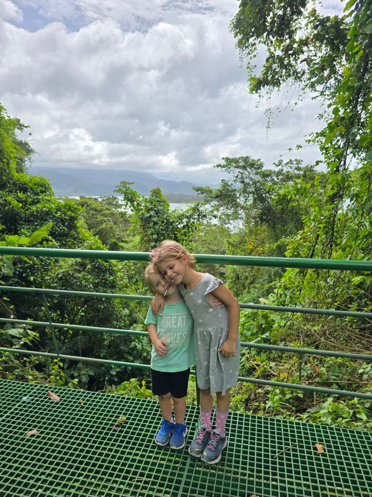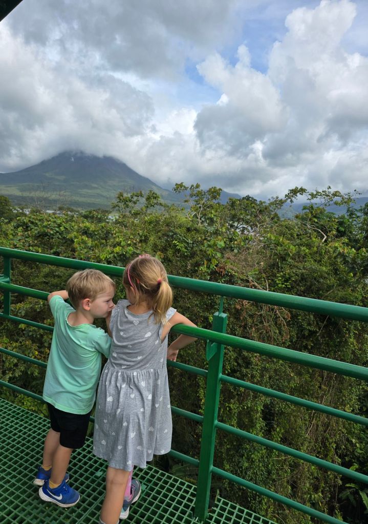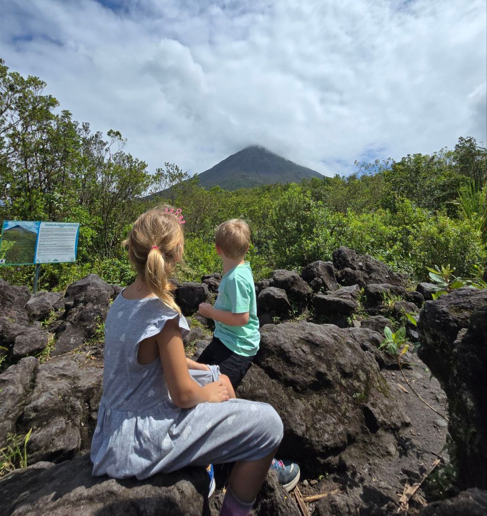 Gerne wäre ich heute morgen direkt wieder in den Pool gesprungen, aber Mama und Papa sind mit uns zum Nationalpark Volcán Arenal gefahren. Dort haben wir zwei kleine Wanderung gemacht. Die erste im „Sector Volcán“, bei der wir bis zu einem Aussichtspunkt gelaufen sind, von dem wir einen tollen Blick auf den Vulkan und auch auf den Arenal-See hatten. Hier konnte man auch die Lavaströme aus dem Jahr 1992 erkennen.